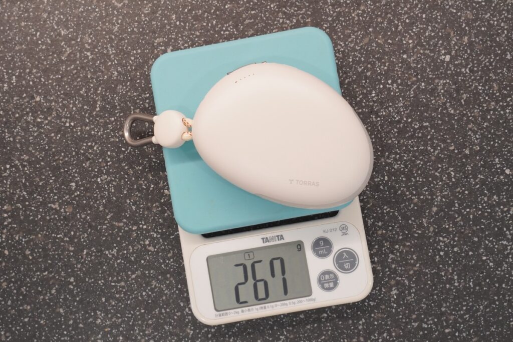 モバイルバッテリー本体の重さは、実測値で267gでした。